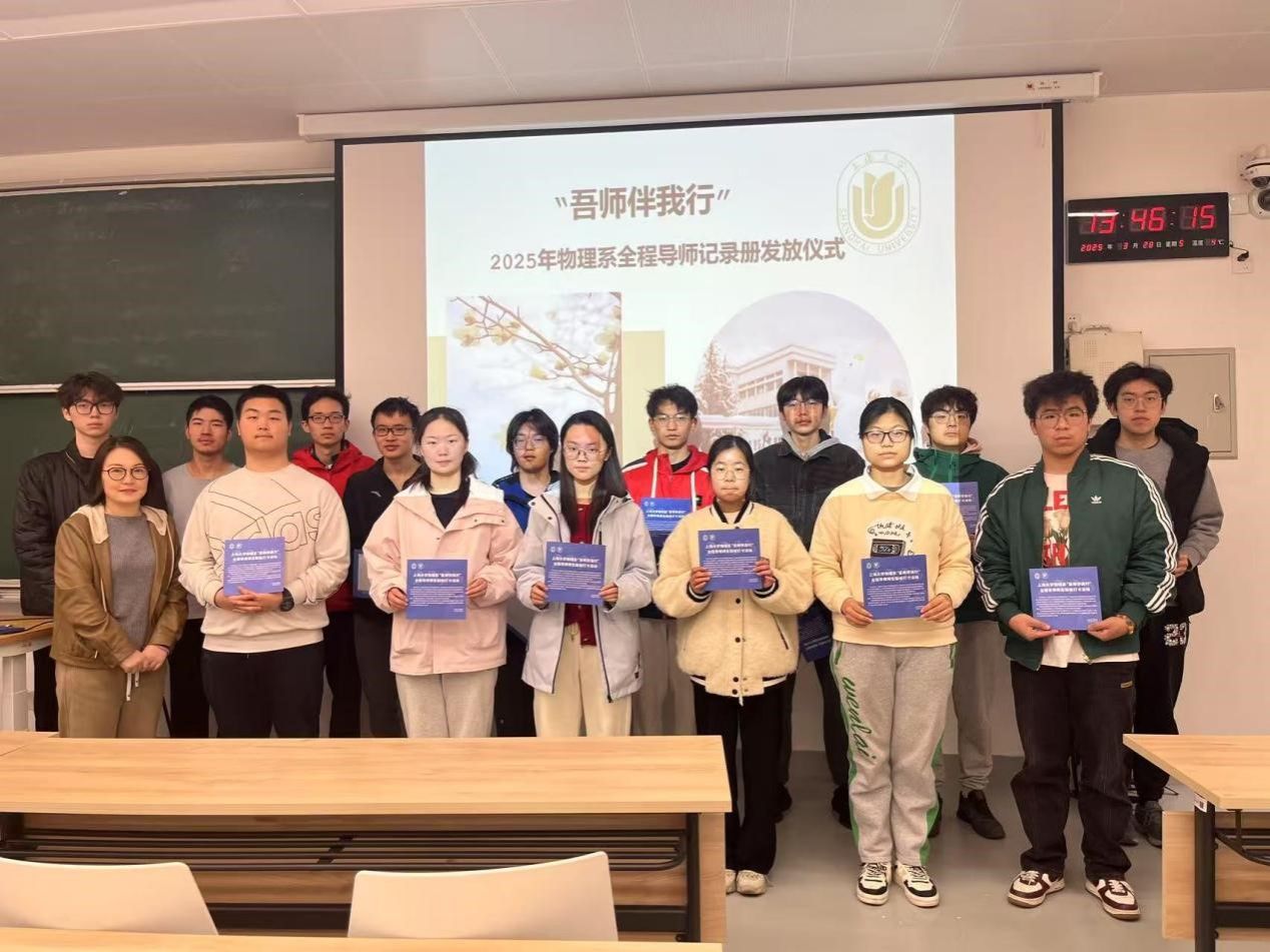 自学校推行全程导师制工作以来,物理系92名专业老师均担任全程导师,占全部专职教师人数的100%,全程导师工作实现在籍学生的全覆盖。物理系为每个新入校的本科生配备全程导师,从大一到大四充分发挥导师在思想引领、人文关怀、学术指导、促进发展等方面的作用,引导学生锤炼品格、学习知识、创新思维、奉献祖国。
