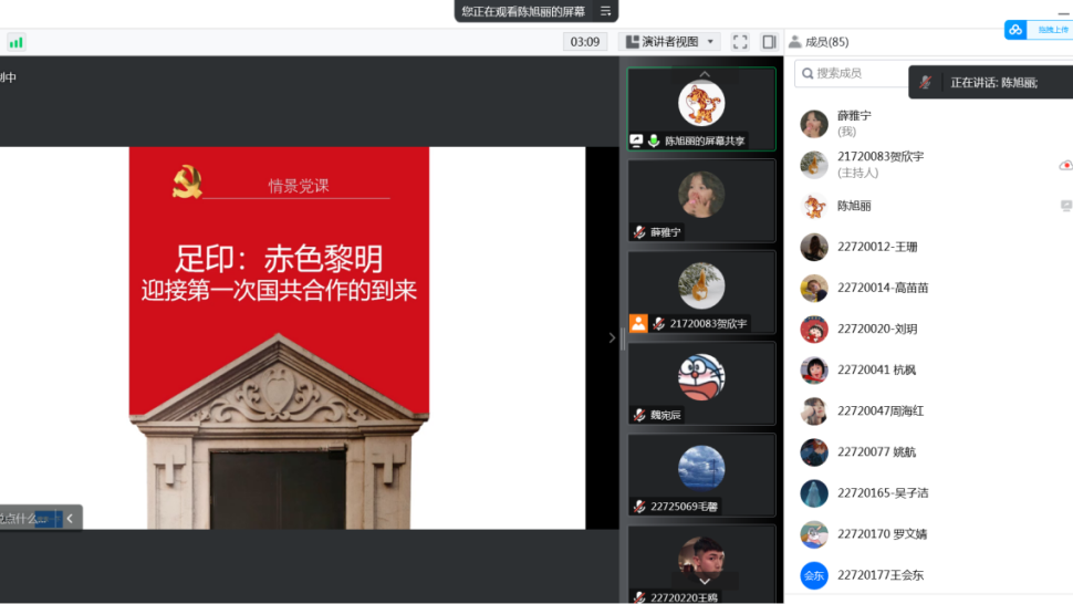 作为首批全国党建工作标杆院系,太阳集团官网8722于10月28日上午10时在腾讯会议上开展题为“足印:赤色黎明”的标杆共建讲座,邀请了上海市中共三大后中央局历史纪念馆主管陈旭丽主讲,旨在向广大青年介绍第一次国共合作背后的故事。本次讲座由太阳集团官网8722辅导员魏宛辰主持,太阳集团官网8722师生百余人参加了本讲座。