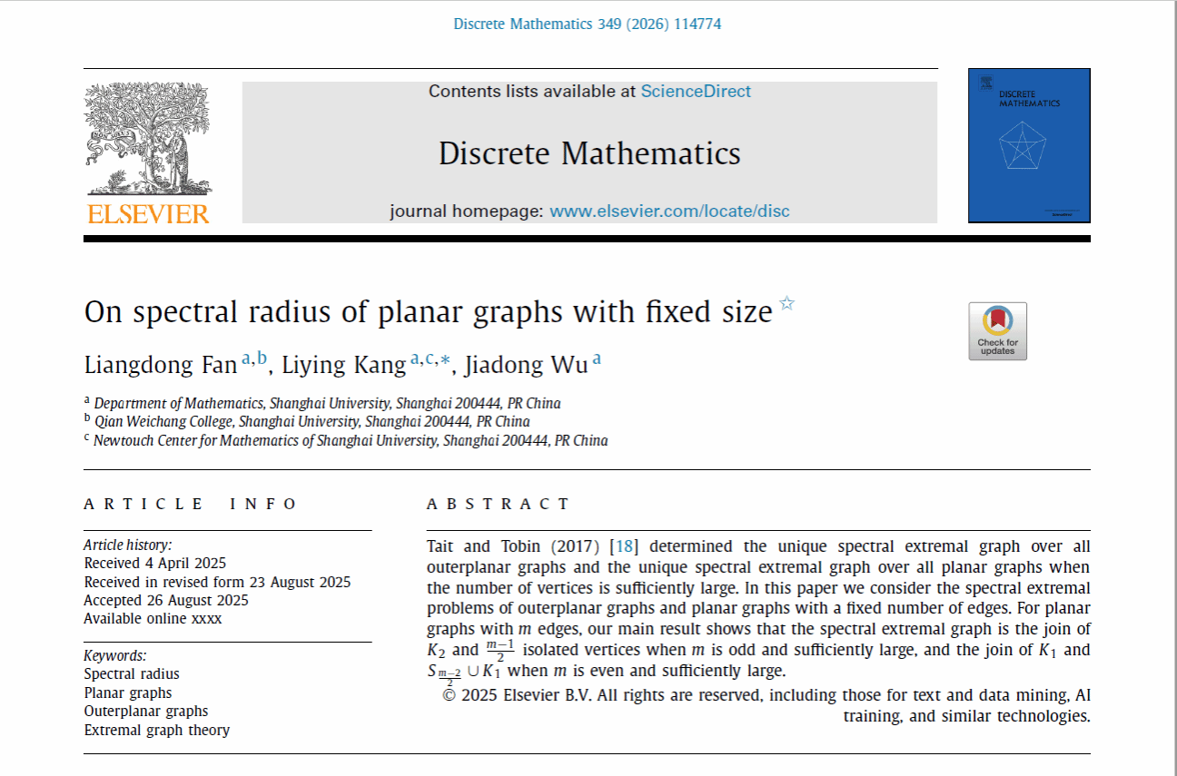 近日,太阳集团官网8722数学系康丽英教授指导的钱伟长学院大四本科生范良东以第一作者身份,在国际知名学术期刊《Discrete Mathematics》上发表题为“On spectral radius of planar graphs with fixed size”的科研论文。该论文研究了固定边数条件下平面图与外平面图的谱半径极值问题,给出了相应的极值图构造,对图谱理论与极值图论领域具有积极的理论推动作用。